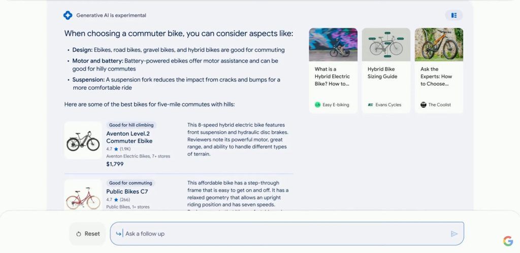 گوگل کروم با استفاده از قابلیت «Search Generative Experience یا SGE» و بهرهمندی از هوش مصنوعی مولد، در هنگام جستجو با گوگل، نتایج بهتری را به شما ارائه میدهد؛ مثلاً اگر کالایی را در گوگل جستجو کنید، علاوه بر لینکهای مرتبط با آن، توضیح مختصری در مورد آن کالا به همراه لینکهای خرید اینترنتی آن نیز میبینید؛ در ضمن لینک سوال های مرتبط با موضوع نیز نمایش داده میشوند.