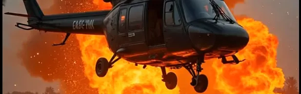 @orbit_right @aerial_drone super slow motion of helicopter lowering on fire blades spinning slow motion, helicopter dropping down crashing, spin camera around to the right, eye contact entire time as moving
